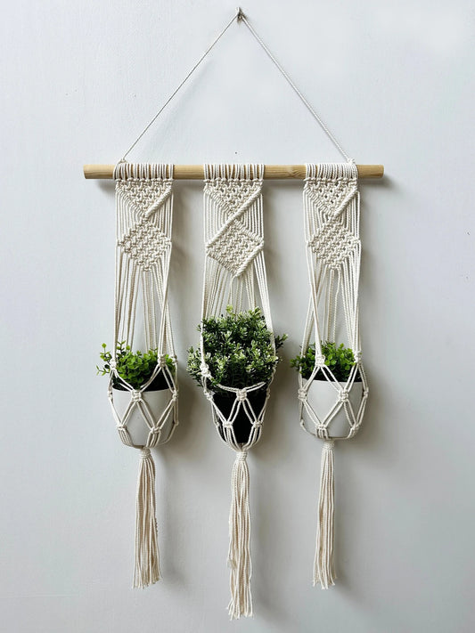 Natural Macrame 3-Pot Hanging Planter | Boho-Inspired Triple Plant Holder for Wall or Window Display